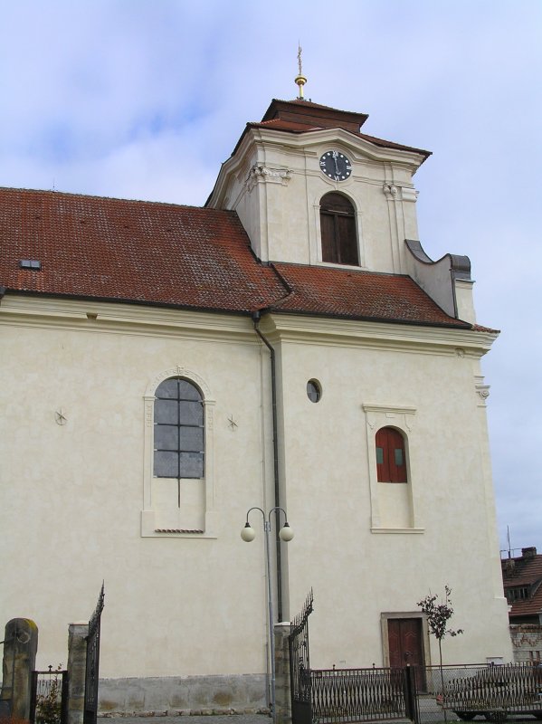 PopisSeverozápadně od Masarykova náměstí. - Původní dřevěný kostel byl připomínán písemně poprvé r. 1352 jako farní. Patrně na jeho místě byl v l. 1759-1760 vystavěn dnešní barokní kostel. R. 1909 byl kostel rekonstruován podle plánu R. Němce z Hradce Králové. - Jedná se o složitou barokní centrální stavbu elipsovitého půdorysu s čtvercovým presbytářem a s přilehlými oboustrannými oratořemi a protilehlou čtvercovou kruchtou. Za presbytářem je hranolová věž (přistavěná r. 1832) a pod ní sakristie, zevně pojatá jako průčelí s nárožními pilastry. Věž je zakončená jehlancovou střechou. Stěny hladké, okna vysoká s půlkruhovými záklenky. Vnitřek sklenut plackami na nakupených pilastrech. - Zařízení: převážně rokokové: hlavní oltář rámový; dva boční oltáře sv. Barbory (portálový, pilastrový) a sv. Anny (protějškový); v lodi oltář sv. Jana Nepomuckého (portálový, pilířový); oltář sv. Vavřince (barokní, rámový, rozvilinový); rokokové varhany; klasicistní kamenná křtitelnice.