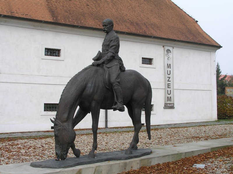 PopisPřed Muzeem T. G. Masaryka v Lánech. - První jezdecká bronzová socha T. G. Masaryka je 3,2 m vysoká, 3,5 m dlouhá a váží asi 1200 kg. Zachycuje zakladatele československého státu jak zamyšleně sedí na pasoucím se koni a v ruce drží čepici. Celá socha i s trávníkem z bronzu je umístěna na nízkém pískovcovém podstavci. - Autorem sochy je sochař Petr Novák z Jaroměře, pískovcový podstavec navrhl architekt Miloslav Čejka. Bronzová skulpturu byla odlita v umělecké slévárně v Horní Kalné. - Slavnostně byla odhalen při příležitosti oslav 160 let od Masarykova narození.