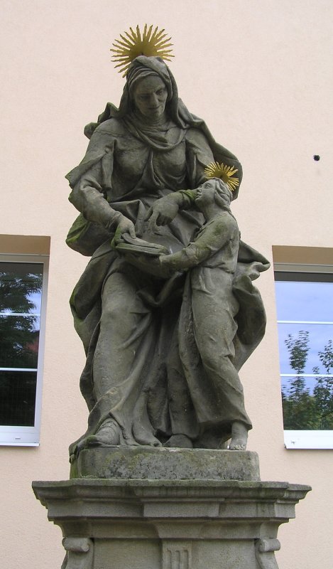 Barokní pískovcová socha sv. Anny u školní budovy, naproti zámeckému areálu. Socha datována rokem 1739 je od sochaře Ferdinanda Vendy. Stojí na plasticky členěném hranolovém podstavci a ztvárňuje sv. Annu sklánějící se k dívce Panně Marii. Panna Maria stojí při levé straně postavy sv. Anny, přidržuje otevřenou knihu a pohled upíná k tváři sv. Anny. Postava sv. Anny je mírně předkloněná, pravou rukou přidržuje knihu a levou rukou ukazuje na otevřené stránky knihy. Sv. Anna je oděna v dlouhý šat a roucho přehozené přes vlasy a splývající po zádech. P. Maria i sv. Anna mají k hlavě připevněnou kovovou zlatě natřenou paprskovitou svatozář.