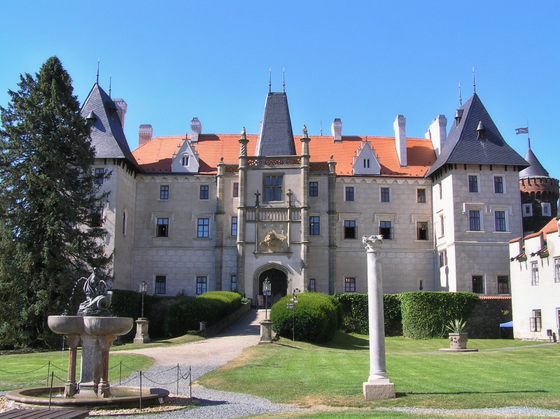 Jméno korporace Žleby (zámek) Místo Žleby (Česko) Události 1289 - první zmínka 1741 - majetkem Auerspergů Osobnosti Lichtenburkové (rod) Auerspergové (rod) Škvor, Benedikt - architekt Schmoranz, František - architekt Popis Nachází se 7 km jihovýchodně od Čáslavi ve stejnojmenné obci v meandru řeky Doubravy. Původní hrad byl založen asi ve 3. čtvrtině 13. stol. Jindřichem z Lichtenburka, písemně připomínán v r. 1289. V pol. 14. stol. se stal královským majetkem a byl dáván do zástavy šlechtě. Dvakrát jej oblehlo a dobylo královské vojsko, v r. 1427 byl husity zbořen. V polovině 15. stol. ho nechal pozdně goticky obnovit a přestavět Jan z Dubé a Vízmburka. V 16. stol. se tu vystřídala řada zástavních držitelů, z nichž nejvýznamnější byli Bohdanečtí z Hodkova a Václav Chotouchovský z Nebovid. Za jejich držení došlo asi ve 2. polovině 16. stol. k přestavbě starého středověkého hradu na čtyřkřídlý renesanční zámek s arkádovým nádvořím tak, jak se v jádru dochoval dodnes. Od r. 1754 až do 20. stol. byl majetkem Auerspergů. Nejznámějším majitelem z tohoto rodu byl kníže Vincenc Karel Auersperg (1812-1867). Zámek byl přestavěn nejprve pozdně barokně, a v l. 1849-1868 pseudogoticky Františkem Schmoranzem a Benediktem Škvorem. Byl opatřen novodobými hradbami s množstvím věží, aby představoval romantický gotický hrad. Interiér byl vybaven sbírkami zbraní, nábytku, kožených tapet, obrazů, vitráží, rukopisů, knih a luxusního nádobí. Východní křídlo zámku (dnešní I. prohlídkový okruh) sloužilo již od konce 19. stol. jako prohlídková trasa pro veřejnost. Kolem zámku byl založen anglický zámecký park využívající strmý hradní svah i kaňonovitý meandr řeky Doubravy. Na park navazuje obora, kde je chována bílá jelení zvěř. – Čtyřkřídlá patrová stavba v lichoběžníkovém nádvoří s renesančními arkády. Dominantou je mohutná čtyřpatrová válcová věž v jihozápadním nároží. Ze západního průčelí vystupuje polygonální závěr kaple Zvěstování P. Marie a bašty. Nad hlavním portálem reliéf zubra a na jižní fasádě sochy císaře Lothara a prvého Auersperga od J. Maxe. – V letních měsících zde předvádějí sokolníci ukázky své práce s cvičenými dravci. Klíč.slova hrady * zámky * majitelé zámku * gotika * novogotika * renesance * baroko * věže * hradby * zámecké parky * sokolníci * lesní obory * vysoká zvěř Citace POCHE, Emanuel et al. Umělecké památky Čech. 1. vyd. Sv. 4, T-Ž. Praha: Academia, 1982, s. 436-440. DAVID, Petr, SOUKUP, Vladimír. Velká turistická encyklopedie. Středočeský kraj. 1. vyd. Praha: Knižní klub, 2007, s. 328-329. ISBN 978-80-242-1932-5. Druh soub. Soubor jmen korporací - regionální památky Odkazy (1) - Elektronické dokumenty (8) - Odborná literatura, mapy (48) - ČLÁNKY (14) - Regionální literatura - knihy Databáze národních autorit NK ČR