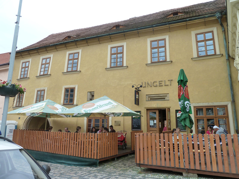 Původně gotický dům ze 16. stol., z té doby zachovány fragmenty oken a okosený portál na fasádě. Ve středověku byl spojený s budovou dnešní radnice. V r. 1377 dostalo město za půjčku panovníkovi ungelt (tržní poplatek) z měření soli a úřad šrotéřství (prodávání soli v režii města). V r. 1544 prodalo město část domu Hanuši Konvářovi, po kterém se nazýval Konvářovským. - Dům byl upraven barokně a v první polovině 19. stol. klasicistně. Dnešní podobu ovlivnily úpravy ve 20. stol., kdy byla zjednodušena klasicistní podoba a na fasádě využito několik původních gotických prvků. Je průchozí s původním průjezdem do dnešní Štechovy ulice. - Dnes je zde restaurace a vinárna. Při rekonstrukci budovy v r. 2006 byla archeology objevena uvnitř domu středověká studna.