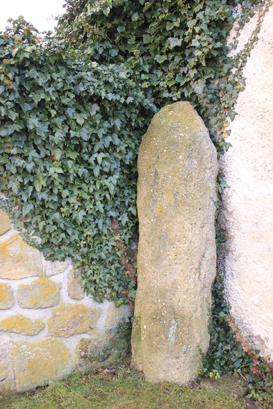 Kamenný sloup, dnes opřen o roh zdi hřbitova, po pravé straně hlavního vchodu do kostela Nanebevzetí Panny Marie. - Výška: 1,8 m; hmotnost: 0,8 t. - Tvořen drobnozrnným oligomiktním slepencem bělošedé barvy. Drobné valounky ve slepenci převážně z křemene a navětralých vulkanických hornin ve velikosti okolo 10 mm. Kámen pochází patrně z jihovýchodního okolí Kamenných Žehrovic. - "Zkamenělec" popisován již od r. 1690. Podle pověsti se jedná o muže, který křivě přísahal a proto zkameněl. Původně stál kámen asi 30 m jižněji, přímo před kostelem, na současné místo přenesen r. 1856. V barokním spise Via sancta (o poutní cestě z Prahy do Staré Boleslavi) je na dobové rytině Zkamenělec zobrazen spolu s Pannou Marií Družeckou; na rozdíl od dnešního stavu má vyznačenou i hlavu. Tato rytina je druhým nejstarším vyobrazením menhiru v Čechách.