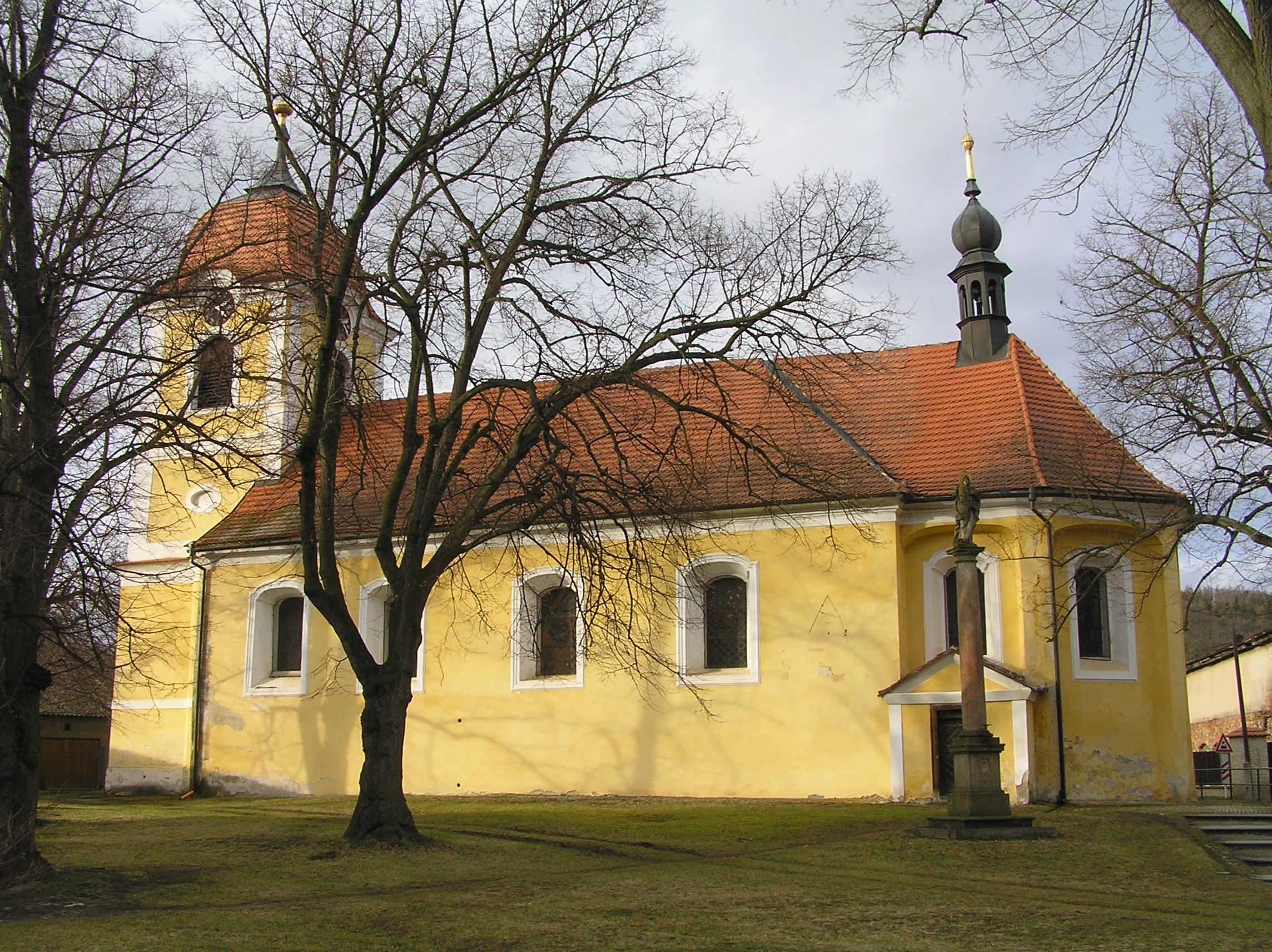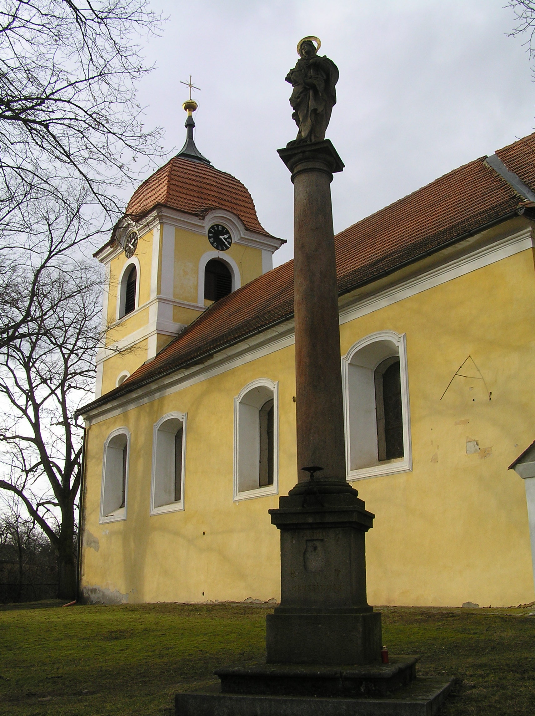 | Popis | V západní části obce, poblíž zámku. - Původně zde postaven gotický kostel sv. Stanislava, jako farní písemně poprvé zmiňovaný r. 1318. Býval kryt šindelovou střechou s malou věžičkou, zvony byly umístěny ve zvonici vedle kostela. Okolo kostela býval hřbitov obestavěný vysokou zdí. V r. 1639 byl kostel vypálen švédským vojskem. Po třicetileté válce kostel r. 1648 znovu vystavěn a zasvěcen sv. Ondřeji, barokní stavba dokončena r. 1654. Při stavbě využito zbytků gotických zdí s opěrnými pilíři, které dodnes tvoří obvodní zdivo kostela. Poblíž kostela r. 1654 postavena dřevěná zvonice, zde byly umístěny zvony a později i hodiny. V r. 1728 zdejší fara povýšena na děkanství. R. 1787 nevyhovující zvonice zbořena, teprve r. 1804 byla ke kostelu přistavěna věž. Do zvonového patra zavěšeny zvony sv. Ondřej, sv. Stanislav a sv. Václav, do báně ve věži umístěny dokumenty o stavbě věže. Na kostele bývaly také sluneční hodiny, jejich ručička se na stěně kostela nalézá dodnes. Ciferník s nápisem "Všeho do času - Bůh na věky" však byl zabílen a již nebyl obnoven. - Jedná se o jednolodní, obdélný kostel s polygonálním presbytářem, se sakristií po severní straně, s obdélnou předsíňkou po jižní straně lodi a se západní hranolovou věží, při níž je schodišťový přístavek. Věž s nárožními lizénami, portálem v ose a půlkruhově ukončenými okny. Okna v lodi obdélná, zakončená stlačeným obloukem. Presbytář sklenut plackou a v závěru lunetami, v lodi strop na fabionu. Kruchta barokní na dvou pilířích, podklenuta plackami a pásy. - Zařízení: hlavní oltář pseudobarokní z r. 1906; rokokový oltář Panny Marie; rokokový oltář Nejsvětějšího Srdce Páně; pseudobarokní kazatelna; dřevěná empírová křtitelnice. V r. 2001 na věž kostela zavěšeny dva nové zvony Václav a Stanislav (původní zrekvírovány v r. 1917) ze zvonařské dílny Grossmayera z Insbruku. Starý zvon Ondřej byl sejmut ze závěsu a postaven ve věži. - U kostela mariánský sloup z r. 1687.