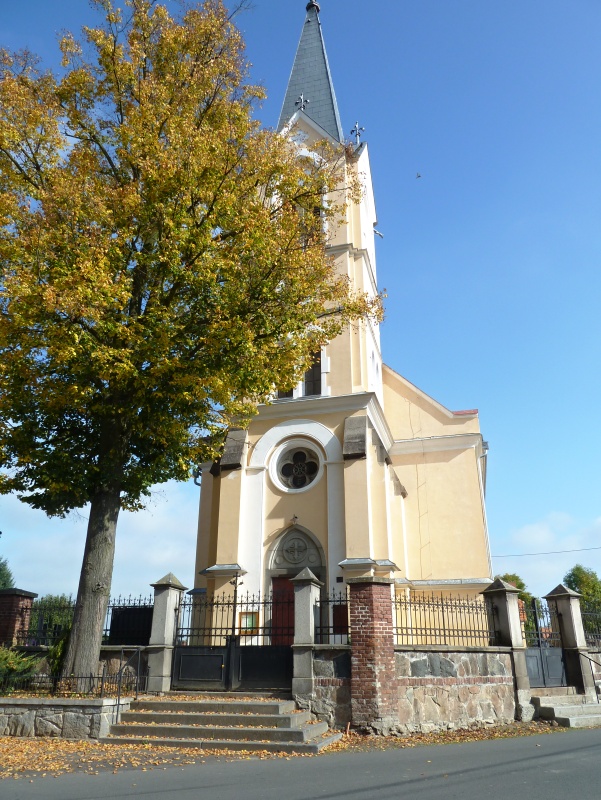 Na okraji obce, na hřbitově. - Jádro kostela gotické, ze 14. stol. Přistavován, zevně pseudogoticky upraven. - Obdélný, jednolodní, s polygonálním presbytářem. Po stranách presbytáře symetricky čtvercové sakristie a oratoř s opěráky. Na západní straně hranolová věž. Okna hrotitá, na severním boku lodi zazděný gotický portál. Presbytář sklenut křížovou klenbou a v závěru paprsčitou žebrovou klenbou. - Zařízení: pseudogotické, z konce 19. stol. a r. 1910; několik otřelých renesančních a barokních náhrobků.