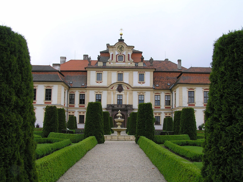 PopisZápadně od bývalé staré vodní tvrze na mírném návrší. Jako své sídlo ho nechal postavit nový majitel panství František Adam z Trauttmansdorffu. Stavba zahájena před r. 1724 podle projektu českého barokního stavitele Františka Maxmiliána Kaňky, s nímž spolupracovali další umělci, především malíř Václav Vavřinec Reiner, který se podílel na výzdobě kaple sv. Josefa, která byla dokončena v říjnu 1725. Po požáru v r. 1754 byly interiéry zámku upravovány a z této doby pocházejí také malby hlavního sálu od Felixe Antonína Schefflera. Tehdy byl změněn průčelní štít, na kterém byl nově umístěn trauttmansdorffský erb a vzhled zámku doplnily sochy Lazara Widmana. Kromě těchto úprav nepoškodily zámek žádné zásadní přestavby. - Jednopatrový půdorysu H, s dvěma obdélnými přístavky po stranách čestného dvora, krytý mansardou s báněmi. Hlavní průčelí je situováno k benešovské cestě. Dominuje mu elegantní štít s balkonem, který zvýrazňuje vstup do zámku. Nižší přízemní budovy po stranách stavby sloužily k hospodářským účelům, jako stáje a kůlny. Napojují se na hlavní zámeckou budovu téměř v pravém úhlu a vytvářejí tzv. čestný dvůr. Zadní průčelí zámku je obráceno do parku. Za F.A.Trauttmansdorffa se jednalo o park francouzský. Často byl využíván k pořádání zahradních slavností a k témuž účelu byly vybudovány i dva zahradní pavilony. Na přelomu 18. a 19. stol. byla barokní zahrada přeměněna v romantický anglický park. Jedinou připomínkou někdejšího francouzského parku je tak úprava čestného dvora a nově založený libosad na pravé straně zámku. - Od r. 1868 zámek vlastní rod Šternberků, s výjimkou let 1943-1945, kdy zde byli Němci a 1945-1995, kdy byl majetkem státu. Současný majitel obývá levé křídlo zámku. Zámeckou expozici tvoří 9 sálů, pokojů a kaple sv. Josefa. Nacházejí se tu i 3 apartmány.