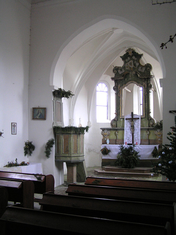 PopisNa návrší na západním konci obce. - Postavený ve druhé polovině 14. stol., upravovaný ve druhé polovině 16. stol. - Jednolodní kostel s obdélným, polygonálně ukončeným presbytářem a obdélnou předsíní na jižní straně. Průčelí kostela člení kamenná vyžlabená římsa, obdélný portál a kruhové okno. Presbytář sklenut polem křížové žebrové klenby a paprsčitě v závěru. Triumfální oblouk mírně lomený, loď plochostropá, předsíň sklenuta hřebínkovou klenbou. Portál na jižní straně lodi polokruhový, profilovaný, zdobený. - Zařízení: převážně z druhé poloviny 18. stol. Hlavní oltář rokokový, panelový; rokoková kazatelna; v presbytáři původní gotický sanktuář. Náhrobní kameny v dlažbě kostela, připomínají majitele místní zaniklé tvrze (dnes již nečitelné). - Okolo kostela hřbitov s náhrobním jehlanecem a křížem z počátku 19. stol. V západním rohu hřbitova dřevěná zvonice.