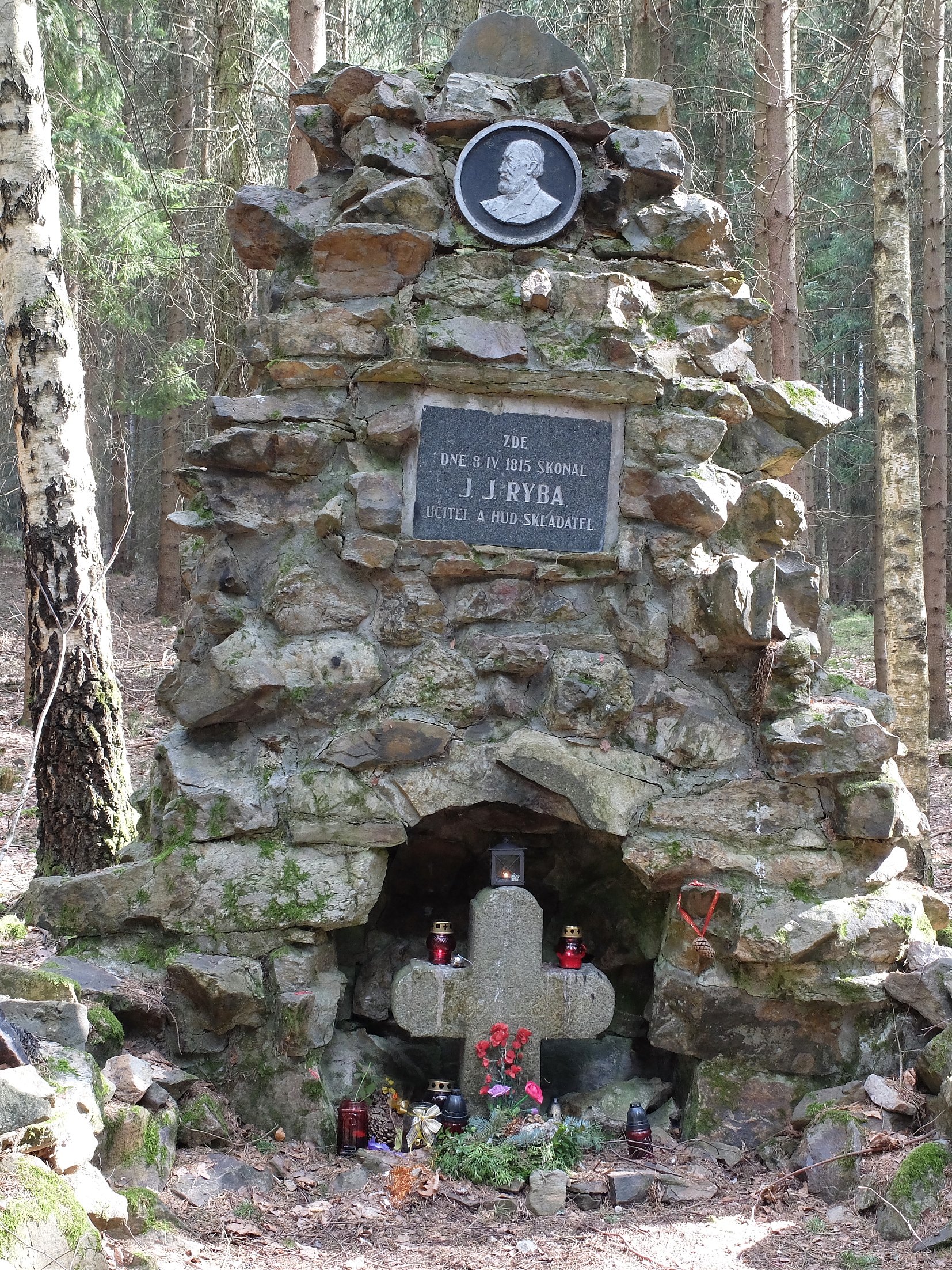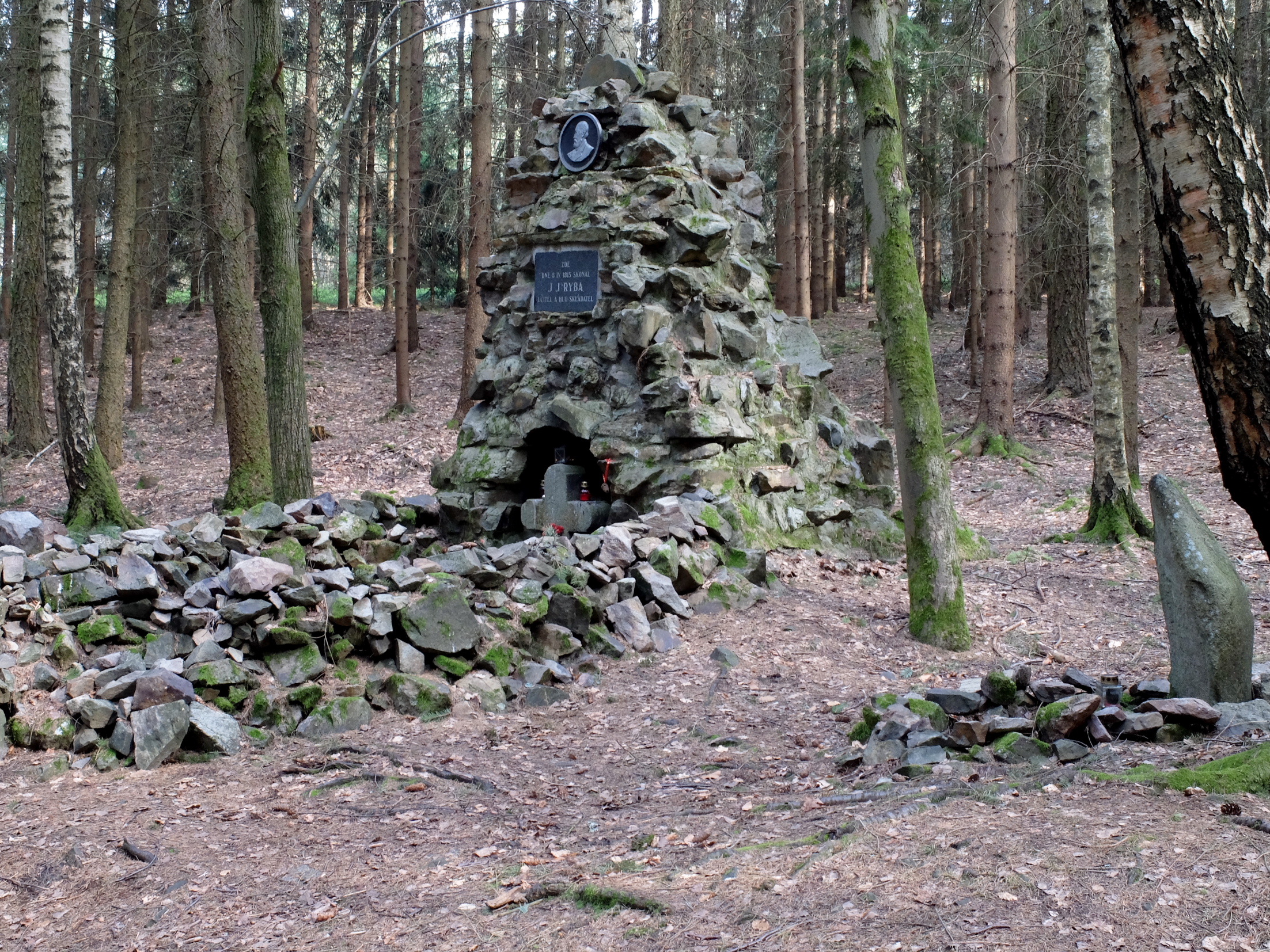 DescriptonZa hájovnou 1 km jihozápadně nad obcí Voltuš, v lese pod vrchem Štěrbina. - V místě, kde 8.4.1815 dobrovolně ukončil svůj život učitel a hudební skladatel Jakub Jan Ryba, autor vánoční mše Hej Mistře. V r. 1854 lesní dělníci nad symbolickým hrobem J. J. Ryby vztyčili kříž (rozměry: 70 x 56 x 18.5 cm), s vyrytým nápisem. V r. 1933 byla nad křížem navršena kamenná mohyla, kříž byl zasazen u paty mohyly ve výklenku.