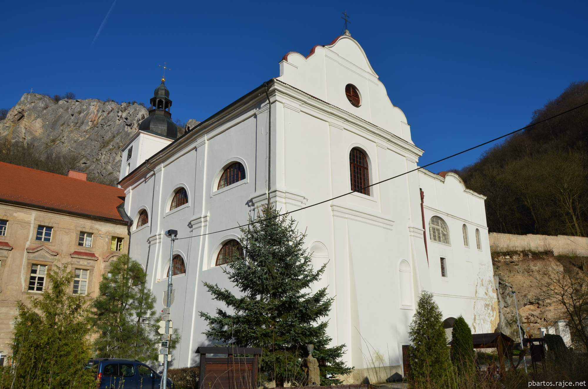 DescriptonPůvodně zde stál klášterní kostel sv. Jana, zvaný Hasenburský, zaniklý patrně během třicetileté války. Za opata Matouše Ferdinanda Sobka z Bilenberka na jeho místě postaven architektem Carlem Luragem v l. 1657-1661 farní kostel Narození sv. Jana Křtitele, zvonice z r. 1600 byla ponechána jako věž. R. 1710 původní klenba nahrazena dřevěnou valenou klenbou za vedení Kryštofa (nebo Kiliána Ignáce) Dienzenhofera, v r. 1859 klenba opět rekonstruována. - Barokní, jednolodní, obdélný kostel s bočními arkádami, s užším obdélným presbytářem, vestavěným do čtvercového klášterního komplexu. Fasády s polokruhovými okny, západní průčelí s polokruhově ukončeným oknem vyvrcholeno volutovým štítem. Vstupní dveře barokní, z první poloviny 18. stol. Vnitřek sklenut valenou klenbou s lunetami. Po jižní straně presbytáře v patře oratoř, po jižní straně lodi empora, otevřená do lodi polokruhovými oblouky. Kruchta na dvou sloupech podklenuta valeně. Na klenbě presbytáře fragment nástěnné malby s výjevy ze života sv. Ivana, na stropě podkruchtí barokní freska Krista Soudce. - Zařízení: hlavní oltář barokní s obrazem Setkání sv. Jana Křtitele s poustevníkem Ivanem od Jindřicha Heintsche (1711); na kruchtě býval Bachmanův obraz z roku 1690 znázorňující položení základního kamene kostela (dnes umístěn v klášteře); velký obraz z 18. stol. Posmívání se Kristu. - Kostel přístupný (průvodce), z boku kostela vchod do Jeskyně sv. Ivana.