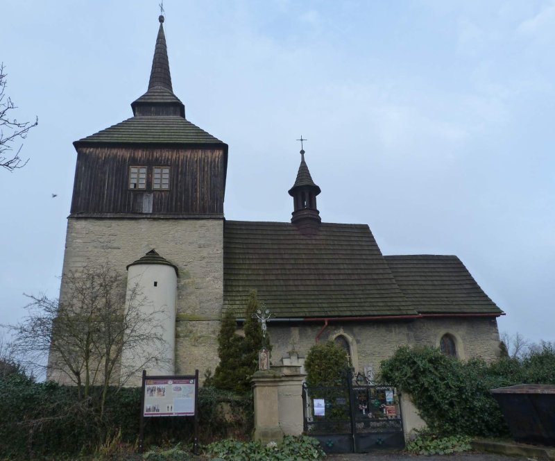 Uprostřed hřbitova na okraji obce. Původně gotický kostel z přelomu 13. a 14. stol., renesančně přestavěný v 16. stol. a nevhodně zmodernizovaný. – Obdélný, jednolodní kostel z lomového kamene, s pravoúhlým presbytářem, k němuž na severní straně přiléhá obdélná sakristie a oratoř. V západním průčelí je hranolová kostelní věž se zbytky sgrafitové výzdoby se šnekovým schodištěm, opatřená v horním patře bedněním. Vnitřek lodi plochostropý, presbytář sklenut renesanční křížovou klenbou bez žeber. Kruchta v patře věže nad otevřeným obloukem s představěným dřevěným balkónem je sklenuta také valeně. Zařízení interiéru převážně barokní a rokokové. Rámový oltář z pol. 18. stol. s obrazem sv. Vavřince, obrazem sv. Jana Křtitele a sochami sv. Mikuláše a Vojtěcha od Jelínků. Zbytek pozdně renesančního náhrobku šlechtického rodu Jeníků z Gensdorfu s obrazem Kalvárie a znaky rodu. Socha piety zdobící hrob u venkovní stěny presbytáře je dílem sochaře B. Kafky z r. 1898. – V sousedství je pozdně barokní roubená fara.