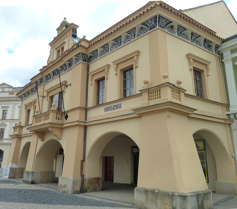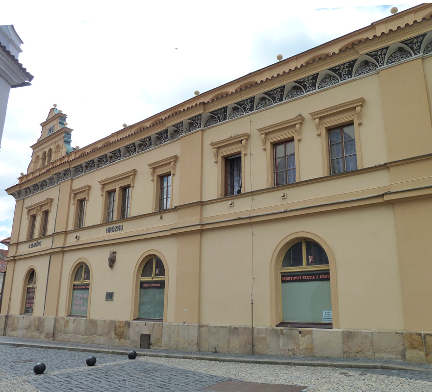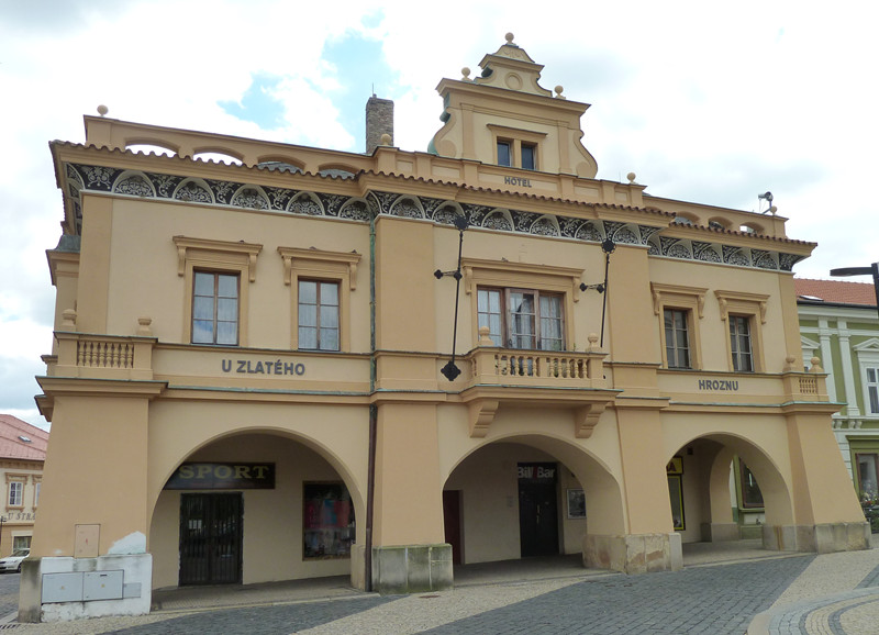 Na jižní straně náměstí. Novorenesanční dům s loubím v hlavním průčelí a domovním znamením - zlatým hroznem. Lunetová římsa ozdobena sgrafity s rostlinnými motivy. - Prvním známým majitelem byl na poč. 16. stol. Hron Divický. Od r. 1856 majitelem Václav Vykysal, který zde provozoval hotel a ochotnická divadelní představení. Poprvé na venkově zde byla úspěšně v podání ochotníků uvedena Smetanova Prodaná nevěsta. - Dnešní podoba domu vznikla novorenesanční přestavbou v r. 1903. - V l. 2009-2010 proběhla oprava fasády. Byla např. restaurována lunetová římsa s rostlinným sgrafitovým dekorem, balkón, doplněn nápis HOTEL U ZLATÉHO HROZNU.