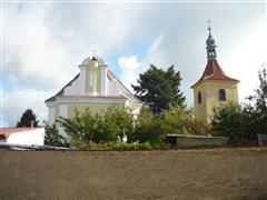 Při Pražské ulici. - Bývalý hřbitovní kostel byl vystavěn okolo r. 1600. Během třicetileté války byl r. 1644 vypálen Švédy, potom byl opraven, r. 1758 však znovu vyhořel. Dnešní podobu získal při opravě v l. 1777-1783 patrně J. Jägera. - Barokní, jednolodní, obdélný kostel s vyhloubenými nárožími a konvexně vypjatým průčelím. V ose obdélného, příčně položeného presbytáře je obdélná sakristie. Průčelí s nárožními lizénami a volutovým štítem s nikou, portál z r. 1677. Bočné průčelí (jižní datováno r. 1703) a stěny presbytáře jsou členěny podobně. Uvnitř kostela zaoblené kouty, loď oválná, členěná dvojicemi pilastrů, kruchta na dvou pilířích podklenuta valeně s lunetami a sklenuta plackou podobně jako presbytář. Sakristie sklenuta polovinou zrcadlové klenby. - Zařízení: hlavní oltář, kazatelna a sochy sv. Barbory a sv. Kateřiny v nikách presbytáře jsou barokní, z doby okolo poloviny 18. stol. Náhrobek je z r. 1640. - U kostela samostatná zvonice. - V r. 1988 začala obnova kostela a jeho okolí iniciovaná skupinou mladých lidí z Kostelce a z Prahy okolo sochaře Z. Hůly a pedagoga J. Volvoviče. V prostorách kostela a přilehlé zvonice vznikají umělecká díla, organizují se autorská čtení a koncerty. Kostel se dále opravuje a renovuje.