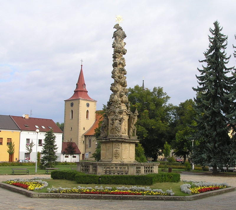 DescriptonUprostřed historického náměstí. - Postaven v l. 1727-1729 na památku poslední morové epidemie (v l. 1711-1715). Autorem je sochař Josef Jiří Jelínek z Kosmonos. - Spodní část tvoří trojboký, konkávně vydutý sokl, na jeho rozích stojí sochy sv. Václava, sv. Vojtěcha a sv. Jana Nepomuckého, patronů české země. Mezi nimi uprostřed se zvedá vysoký, ozdobný sloup. Kamenné zábradlí s balustrádou, které chrání celý sloup, bylo vytvořeno r. 1770. - V r. 1958 byl sloup restaurován.