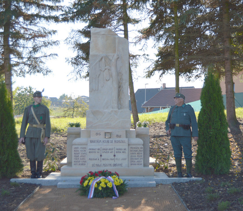 V parku nad zdravotním střediskem. Pomník s třiadvaceti jmény padlých občanů v 1. sv. válce vznikl v r. (?). Původně stál v parku u klempířství Chýský, poté byl přemístěn ke zdravotnímu středisku. V r. 2008 byl z důvodů výstavby nových rodinných domů přemístěn ke zdejšímu hřbitovu, kde postupně zarůstal plevelem a chátral. Nově byl renovován a umístěn do parčíku. Slavnostního aktu jeho odhalení se mj. zúčastnili v dobových uniformách příslušníci 8. zeměbraneckého pěšího pluku z Prahy a skauti a členové Sokola.