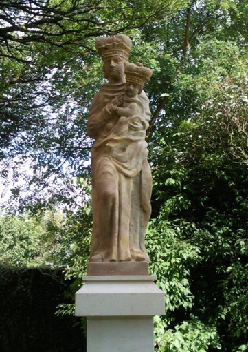 Na místě bývalé kapličky Panny Marie. Původně stávala na cestě ze Lhoty na Třeboc a Ročov vedle pole Václava Hauptvogela. Ten ji našel poškozenou a uschoval na svém statku, kde byla dlouhá léta. Barokní socha Panny Marie s jezulátkem pochází z r. 1760. Kamenná plastika je umístěna na masivním hranolovém podstavci z pískovce. V l. 2009-2010 byla socha zrestaurována a podle dobové fotografie vytvořen nový podstavec ak. soch. Jiřím Fialou z Rokycan.