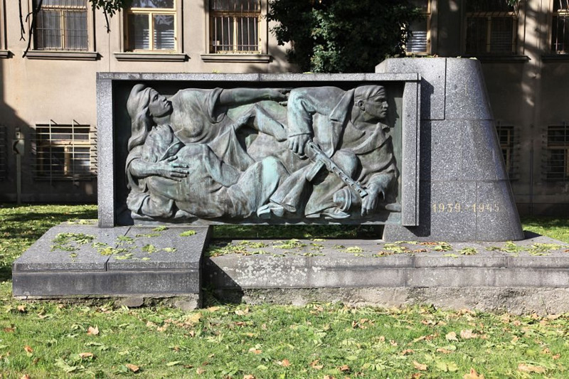 Před budovou bývalého vojenského velitelství. Vznikl z iniciativy Svazu osvobozených politických vězňů a pozůstalých po obětech nacismu. Autorem je Vladimír Jan Hnízdo, jedná se o jeho nejvýraznější dílo. - Památník tvoří vysoký bronzový reliéf se třemi figurami v životní velikosti. Ženská postava zpodobňuje Vlast i Matku, svírajícího svého padlého syna, držícího stále zástavu, a mužská postava odhodlaného Bojovníka, který v jedné ruce drží sovětský samopal a v druhé ruce ukořistěnou německou pancéřovou pěst.