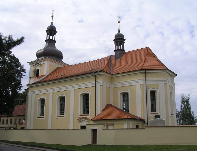 | Descripton | Děkanský poutní kostel na hřbitově. – Původní dřevěný gotický farní kostel zde při svém dvoře založily benediktinky z kláštera sv. Jiří na Pražském hradě. Traduje se, že okolo r. 1250 přinesli servité, řád služebníků Blahoslavené Panny Marie, do kostela obraz Bolestné Panny Marie, později umístěný na hlavní oltář. Písemně samotný kostel zmiňován poprvé r. 1352 již jako farní. Na počátku 15. stol. (podle letopočtu na nejstarším zvonu pravděpodobně okolo r. 1416) kostel přestavěn. Během husitských válek byl klášterní dvůr i s kostelem vypleněn a pobořen. Kostel byl opraven patrně r. 1560 (tehdy vysvěcen druhý, největší zvon) a potom r. 1656 (vysvěcen třetí, nejmenší zvon). Po třicetileté válce se začala šířit pověst o zázračných účincích obrazu Bolestné Panny Marie na hlavním oltáři, ke kostelu byly pořádány časté poutě. S tím souvisely další opravy a úpravy kostela, které vyvrcholily r. 1693 přestavbou hlavního oltáře. Kostel ale kapacitně stále nevyhovoval, proto nechala v l.1714-1716 tehdejší majitelka panství, hraběnka Antonie Josefa Černínová, postavit na místě původního nový kostel Nanebevzetí Panny Marie. R. 1777 kostel opět opraven a částečně i nově vybaven mobiliářem. – Jedná se o barokní, jednolodní, obdélný kostel s trojboce ukončeným presbytářem s obdélnými sakristiemi po stranách. V západním průčelí kostela hranolová věž, členěná v přízemí i v patře pilastry a prolomená obdélným vstupním portálem se supraportou a bohatě členěnou římsou. Okno v patře věže polokruhové. Boční fasády členěny lizénovými rámci a segmentovým záklenkem ukončenými okny. Dva boční vstupy ve východní stěně lodi jsou dnes zazděné, dříve patrně sloužily především v době poutí. Presbytář, loď i sakristie sklenuty valenou klenbou s lunetami. V západní části lodi konvexně vypnutá kruchta. – Zařízení: hlavní oltář z r. 1693, na něm pod baldachýnem poutní milostný obraz Bolestné Panny Marie (Pieta, uváděný jako kopie Panny Marie Bolestné Mesinské ?); dva boční oltáře sv. Jana Nepomuckého a Ukřižování; dva protějškové oltáře sv. Barbory a Sv. rodiny; kazatelna, lavice a varhany z počátku 18. stol. Gotické tabulové obrazy sv. Václava a sv. Jiří uloženy v muzeu v Mělníce. - Ve věži kostela zavěšeny dnes pouze dva zvony. – Na hřbitově u kostela barokní márnice. R. 1794 před kostelem postaven dřevěný kříž a vysazeny dvě lípy. Kříž později nahrazen železným, lípy jsou před kostelem dodnes.