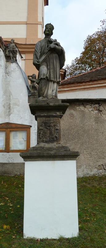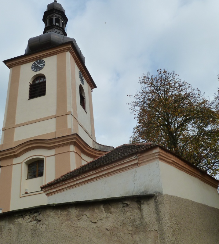 Na hřbitově. - Kostel s raně gotickým jádrem, obdélný, s čtvercovým presbytářem se severní sakristií. V 18. stol. prodloužen na západní straně o kruchtovou část s hranolovou věží. Okna hrotitá, s novými kružbami. Presbytář sklenut žebrovým křížem s hranolovými zkosenými žebry na jehlancových konzolách, loď má valenou lunetovou klenbu. Hrotitý triumfální oblouk zdoben gotickou nástěnnou malbou (v šesti kruzích poprsí proroků, ve vrcholu znak), rovněž na jižní stěně presbytáře zbytky gotických maleb (Bičování Krista, Peklo). Malby ze 40. l. 14. stol. - Zařízení: převážně pseudogotické, dále cínová barokní křtitelnice a dva mramorové náhrobky z r. 1753 a 1779. - Před kostelem barokní sochy sv. Jana Nepomuckého a sv. Antonína.