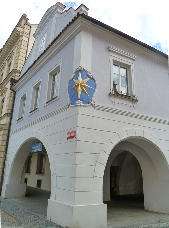Nárožní dům na východní straně Náměstí Míru. Na nároží domovní znamení - zlatá hvězda. První písemné zprávy o domu jsou z r. 1540, kdy byl majitelem Líbal. Od r. 1570 vlastníkem konvař a zvonař Bartoš, jeho dodnes připomíná polychromovaný renesanční portálek, jehož součástí jsou štítky se zvonem a cínovou konvicí. Na poč. 17. stol. dům koupil Martin Vyžral, který pravděpodobně nechal zhotovit raně barokní znamení. Od r. 1632 dům vlastnil podkomoří Filip Fabricius z Rosenfeldu a Hohenfallu, známý jako písař Fabricius. V 19. stol. zde žila rodina Valentů. - Patrový dům s barokním štítem, renesančním portálkem a prolomeným loubím do ulice. Podloubí podklenuto křížovou hřebínkovou klenbou. Pět nových oblouků loubí bylo realizováno až v r. 1945.